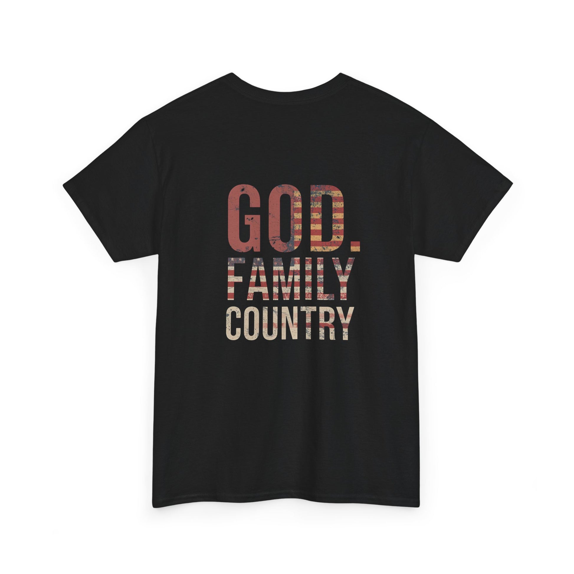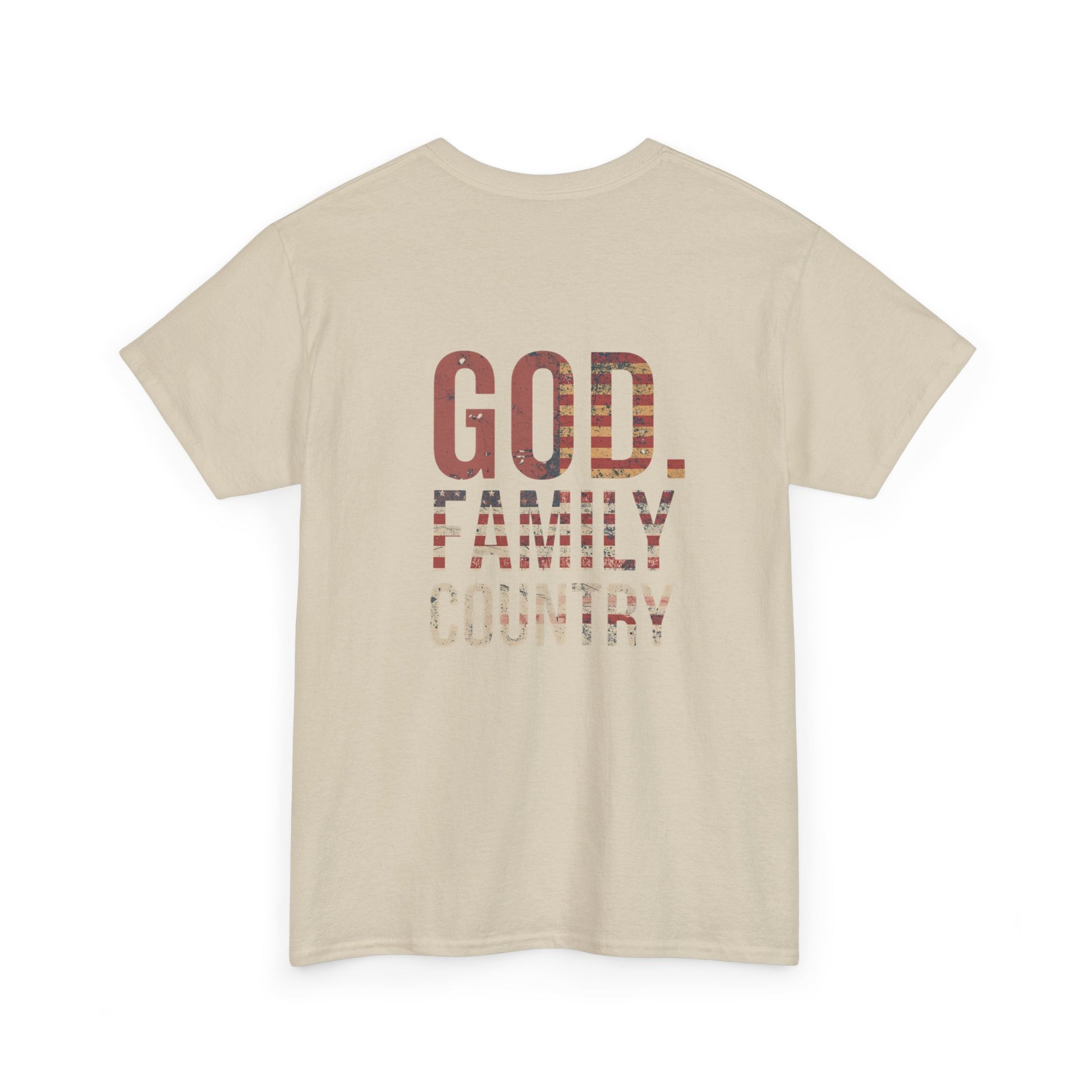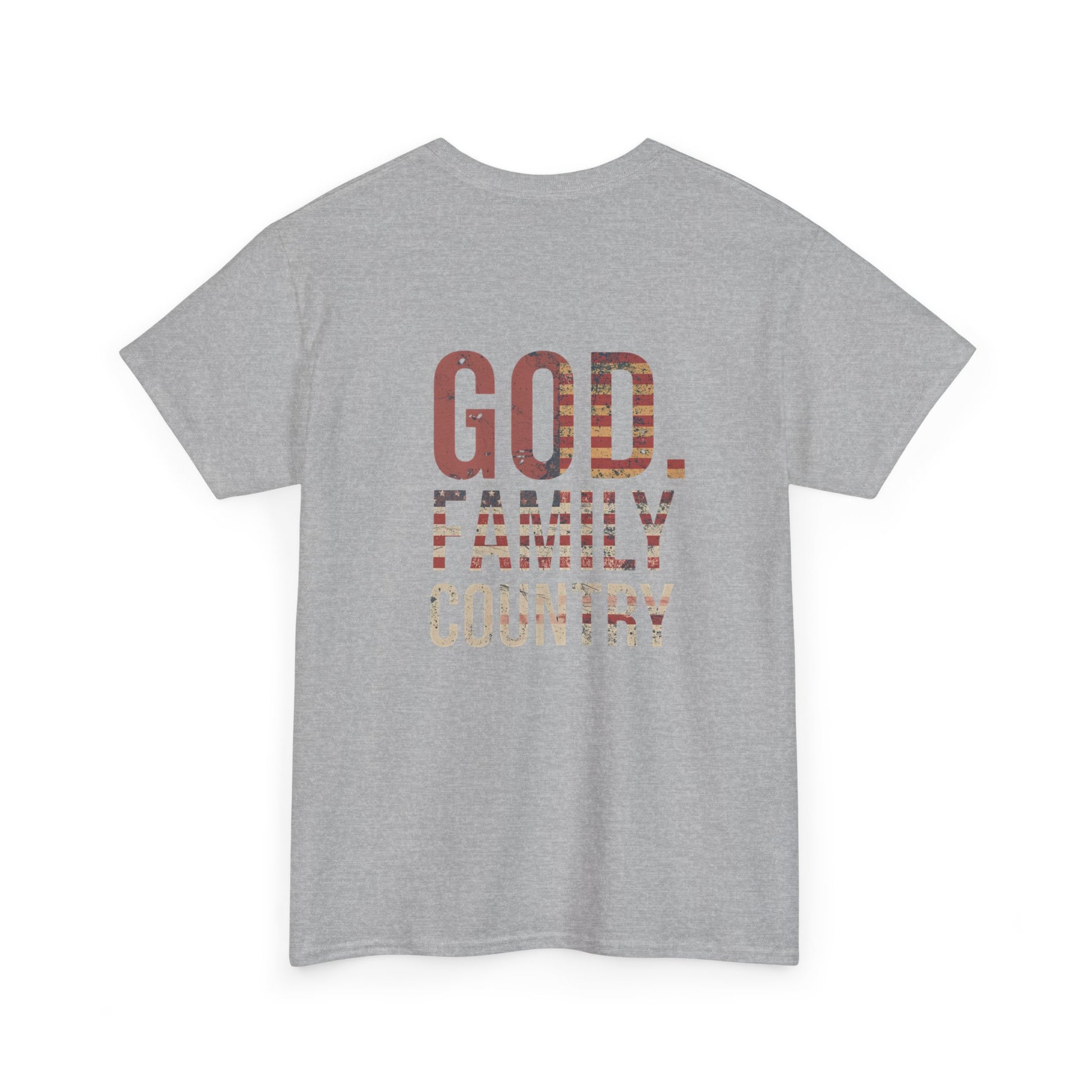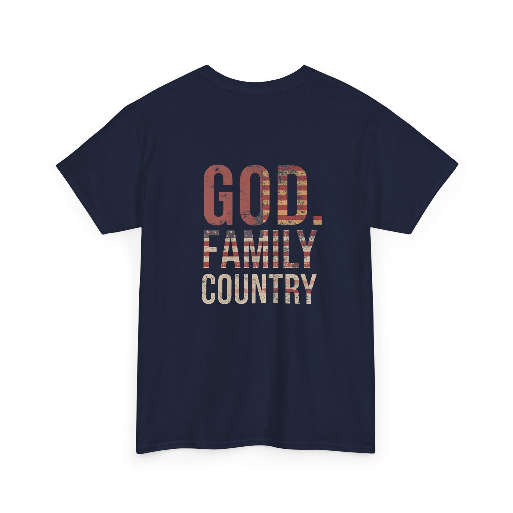 A classic unisex T-shirt featuring a small American flag cross on the front upper left side and 'GOD family country' down the back in American flag lettering. This patriotic tee exudes a strong sense of American pride and is perfect for those who value their faith, family, and country. Ideal for celebrating Independence Day, Memorial Day, Veterans Day, or simply showing love for the USA.