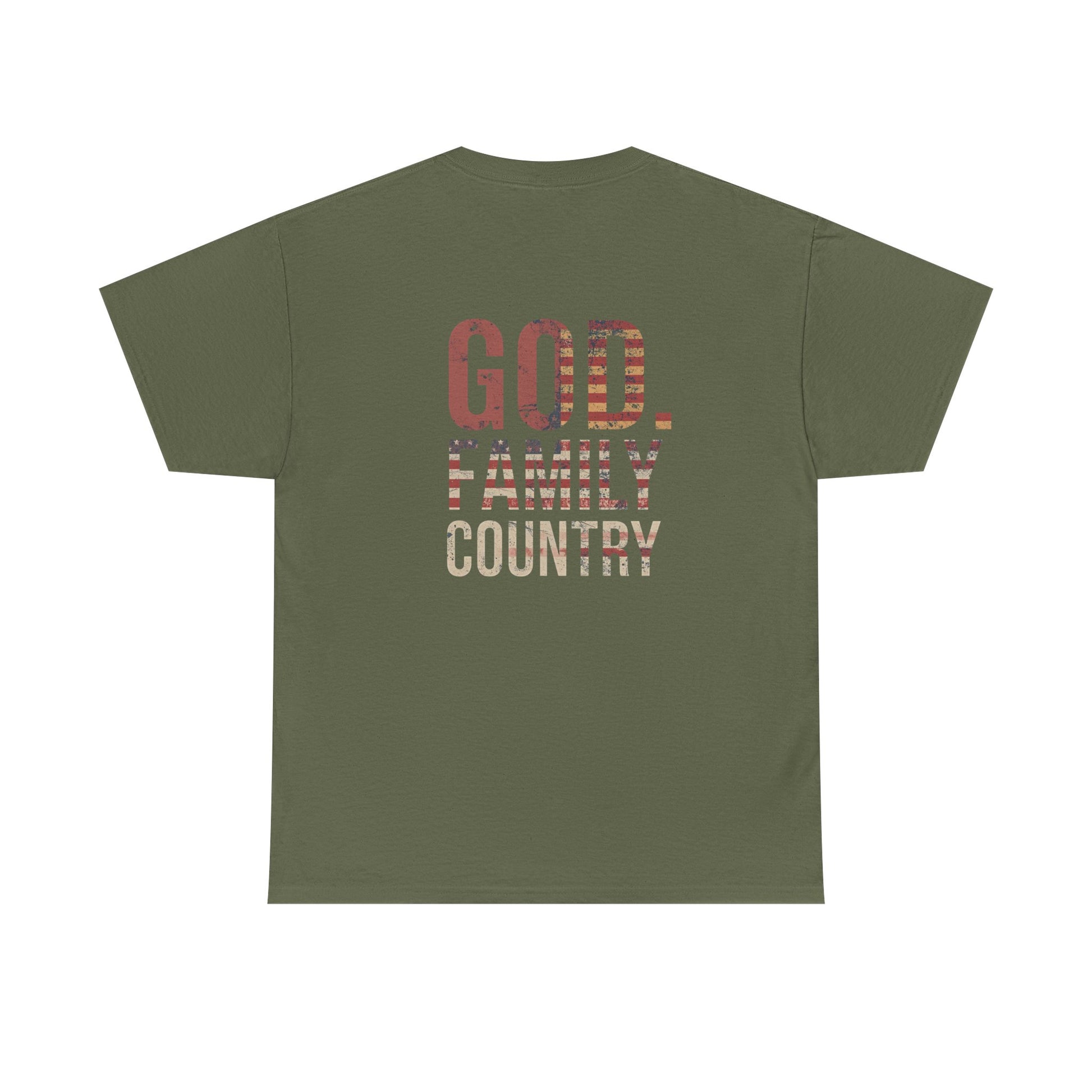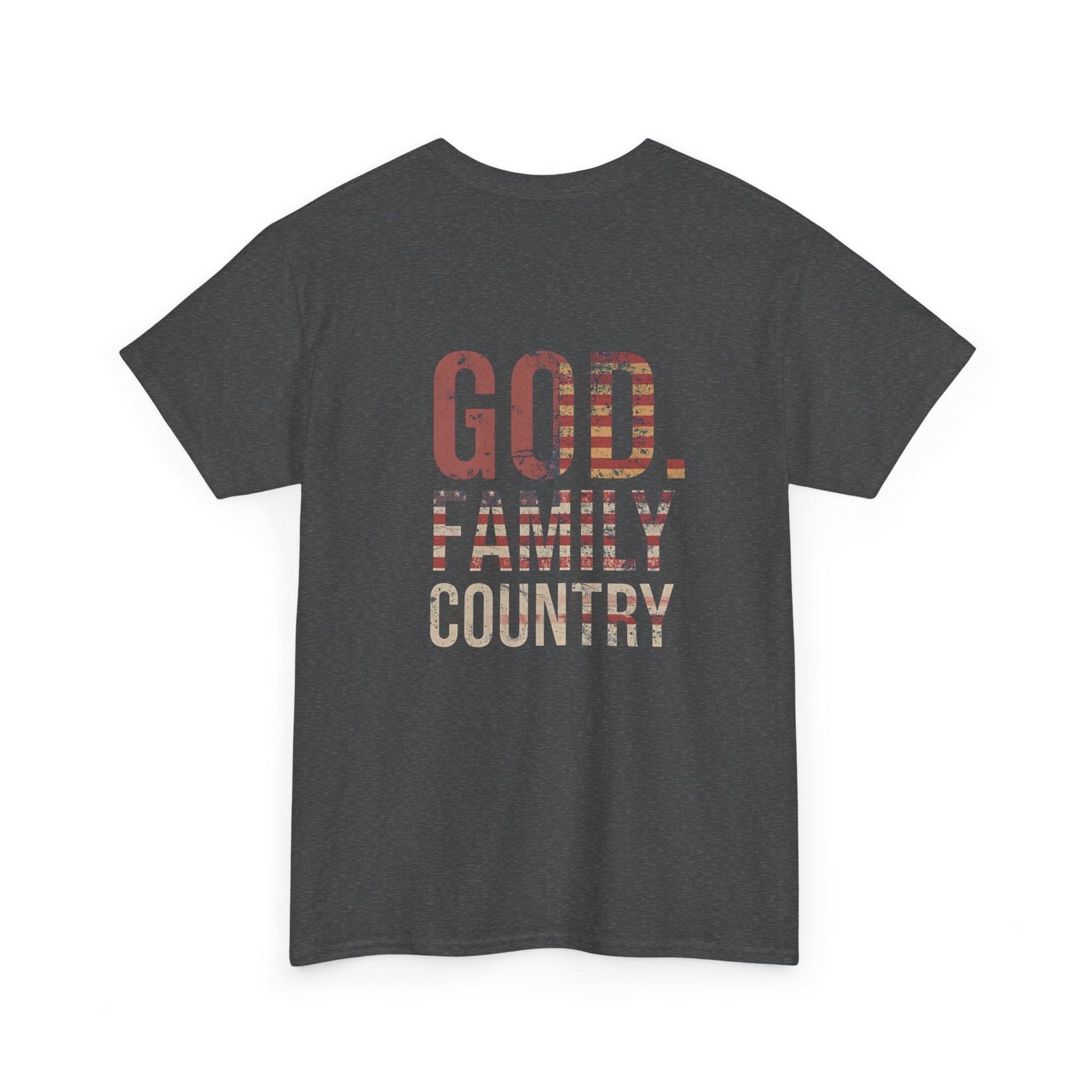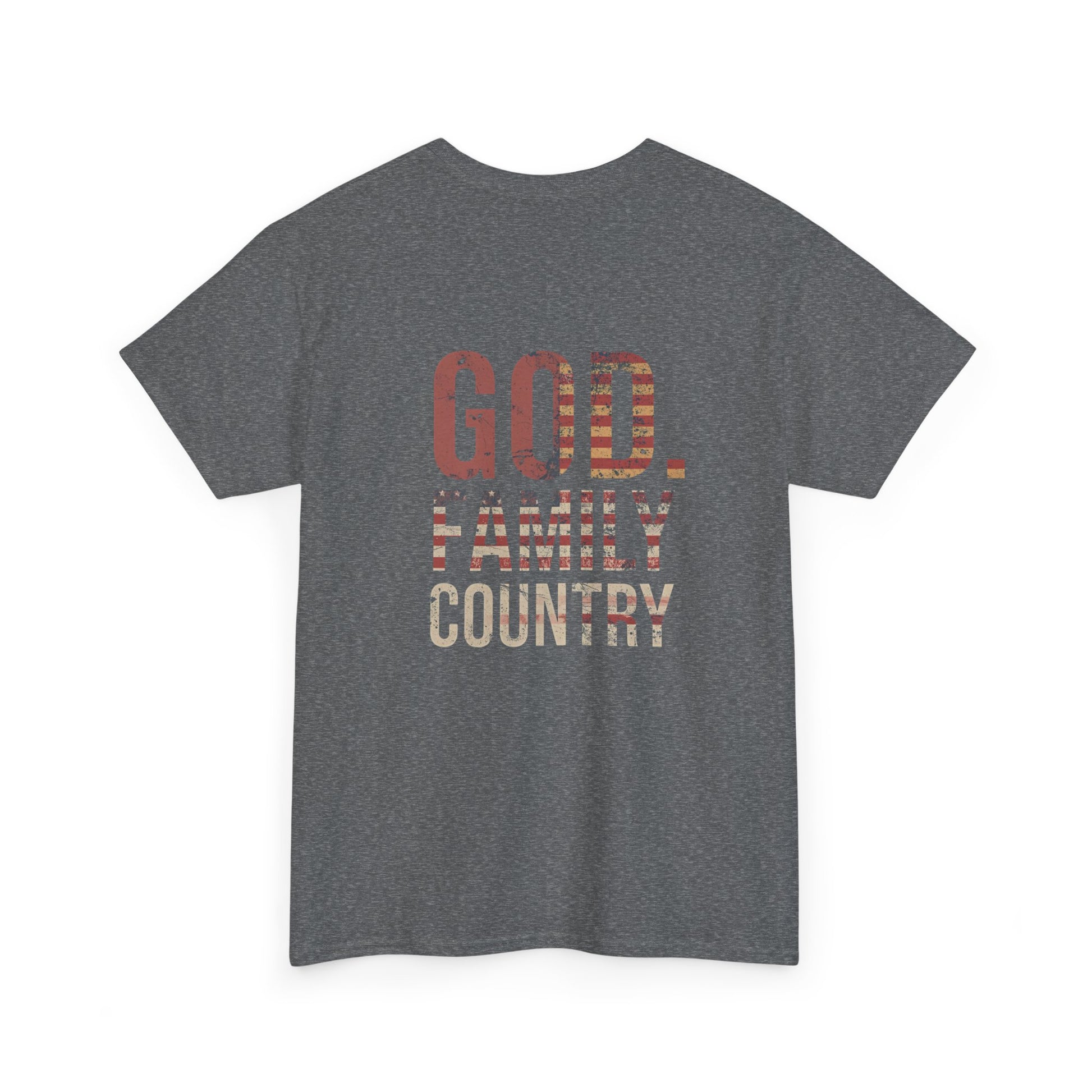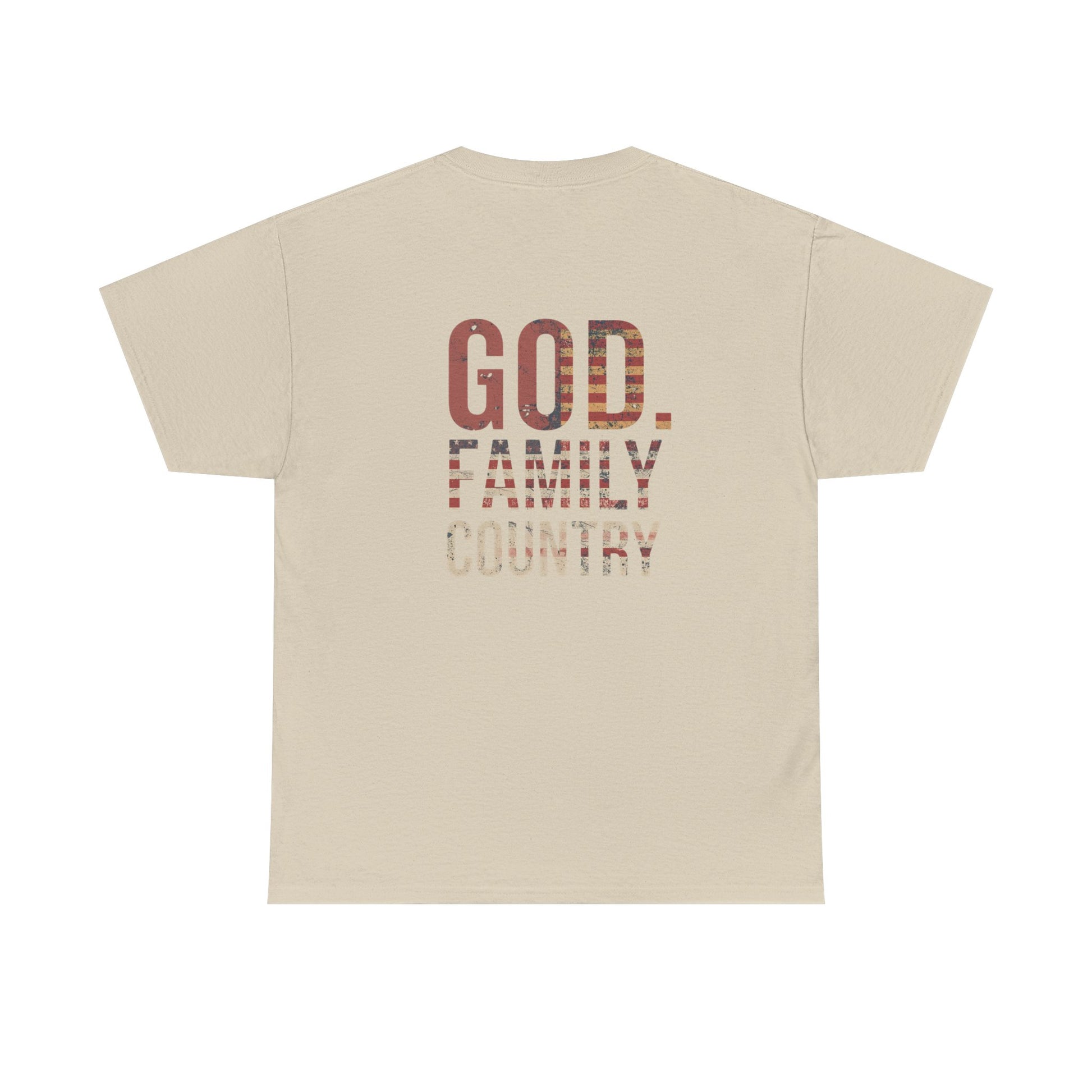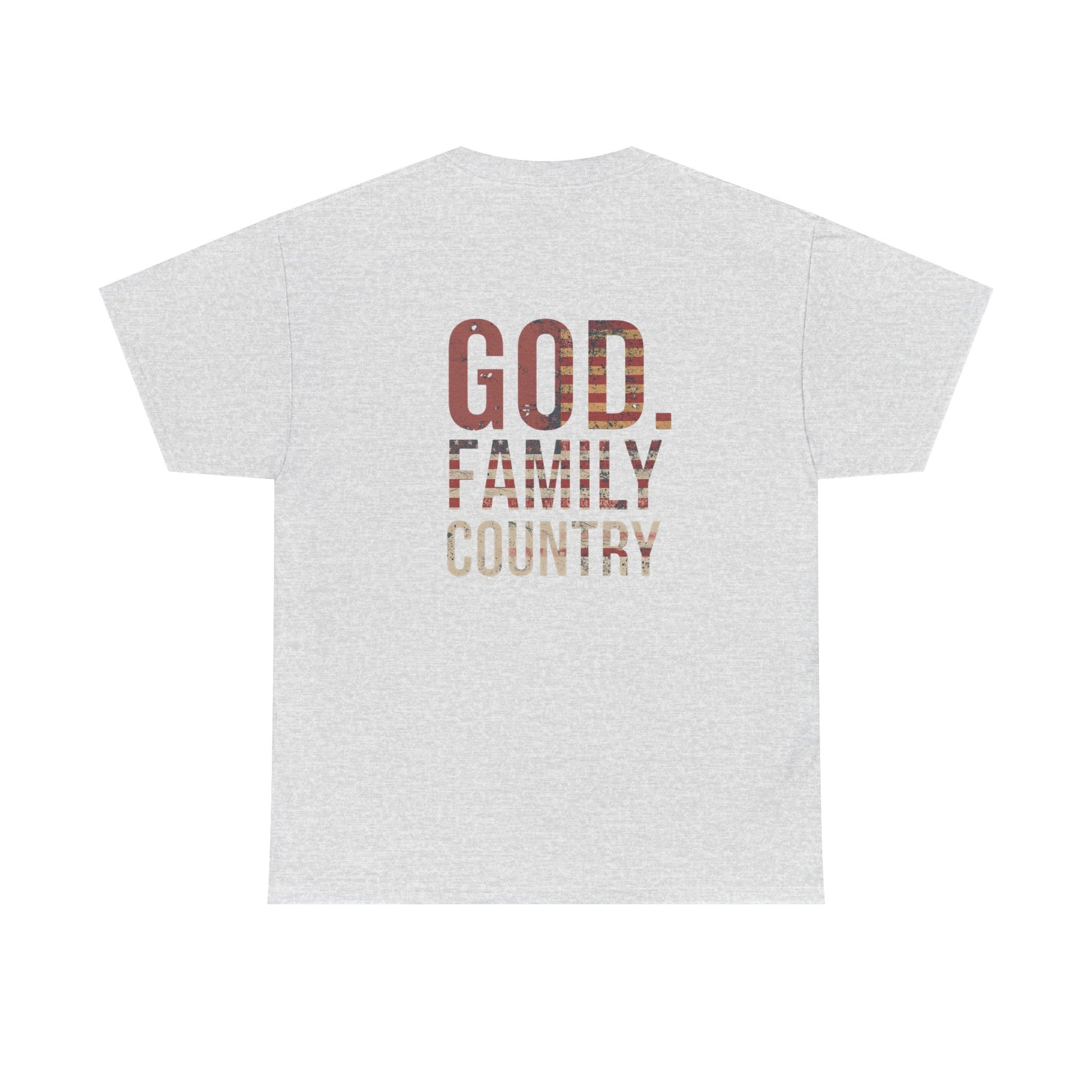 A classic unisex T-shirt featuring a small American flag cross on the front upper left side and 'GOD family country' down the back in American flag lettering. This patriotic tee exudes a strong sense of American pride and is perfect for those who value their faith, family, and country. Ideal for celebrating Independence Day, Memorial Day, Veterans Day, or simply showing love for the USA.