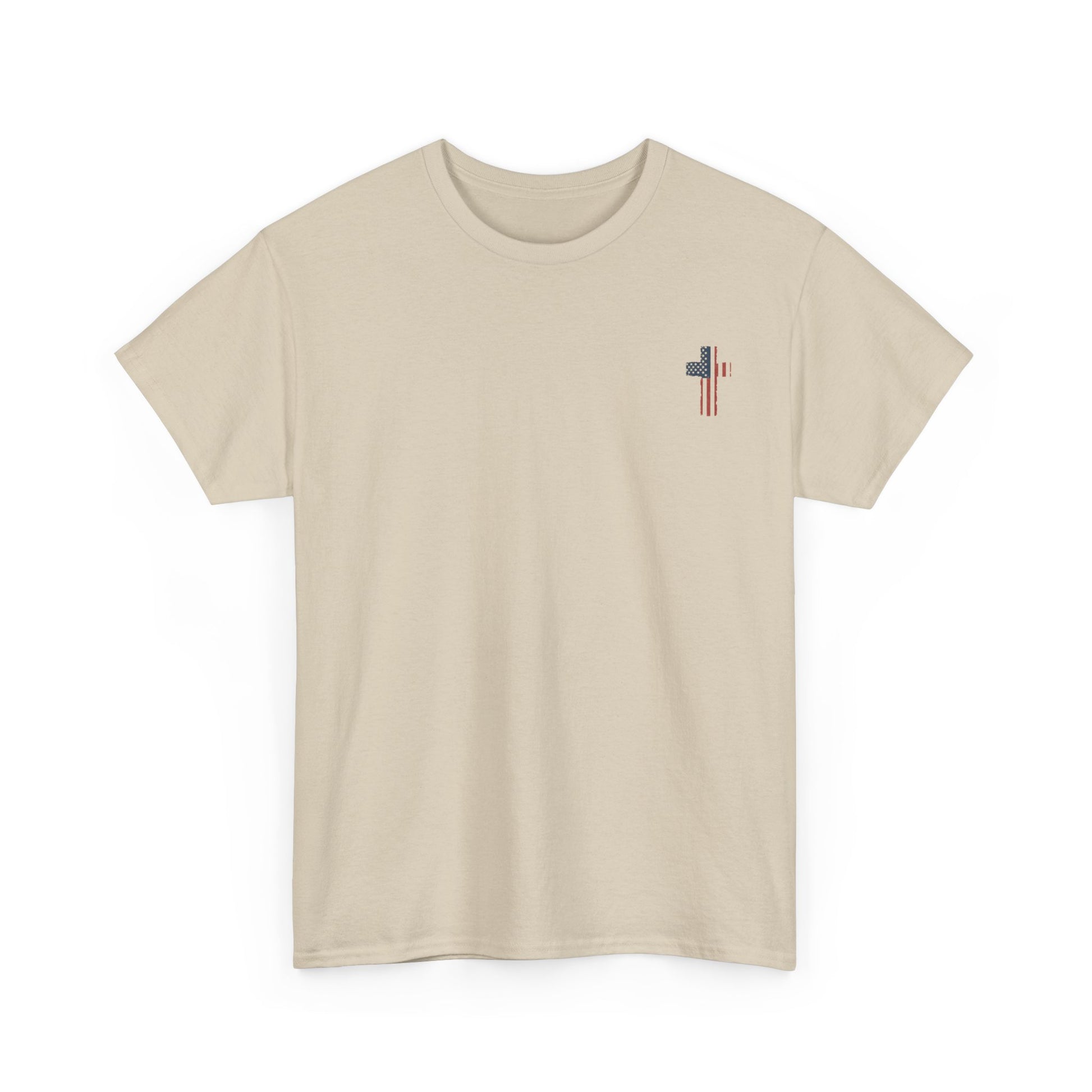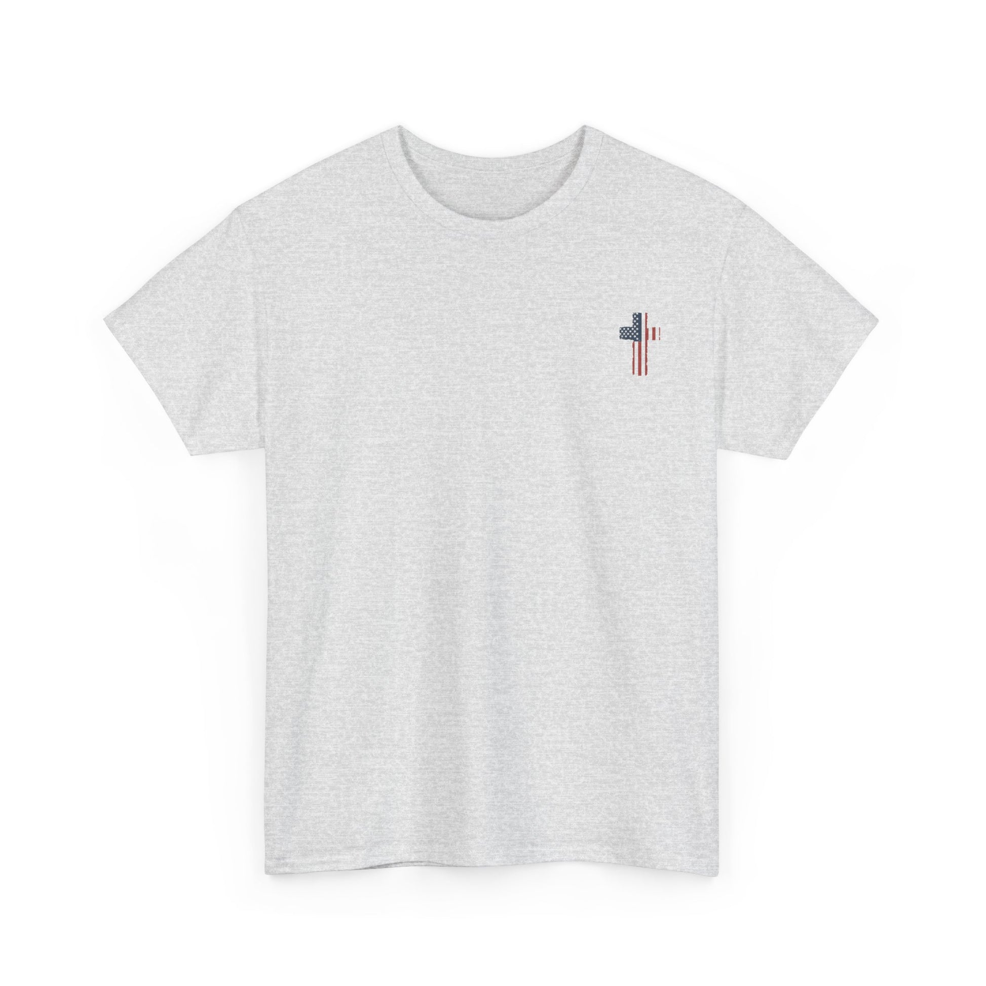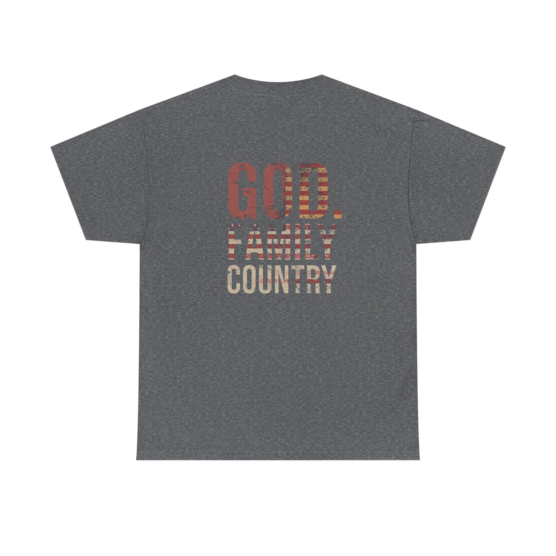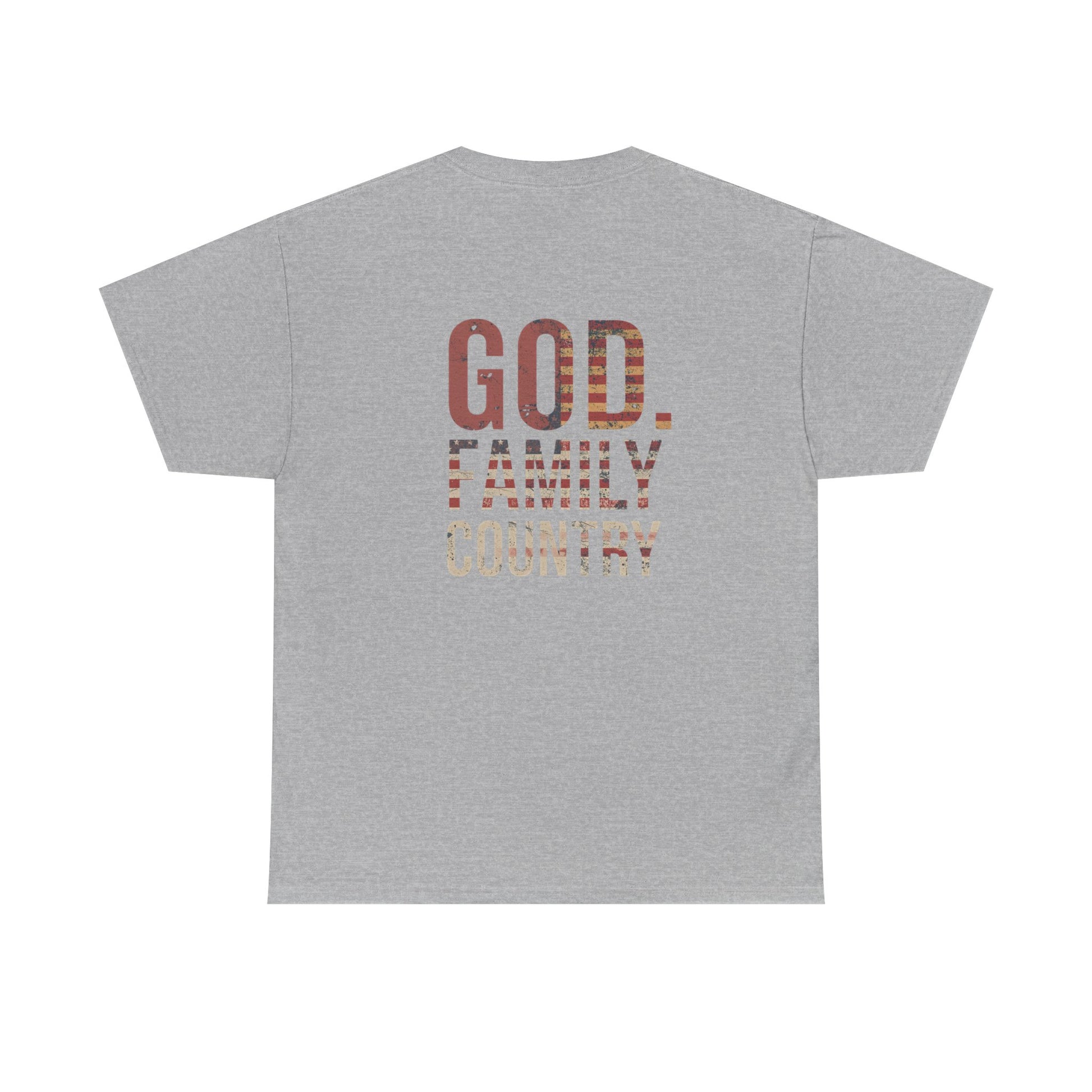 A classic unisex T-shirt featuring a small American flag cross on the front upper left side and 'GOD family country' down the back in American flag lettering. This patriotic tee exudes a strong sense of American pride and is perfect for those who value their faith, family, and country. Ideal for celebrating Independence Day, Memorial Day, Veterans Day, or simply showing love for the USA.