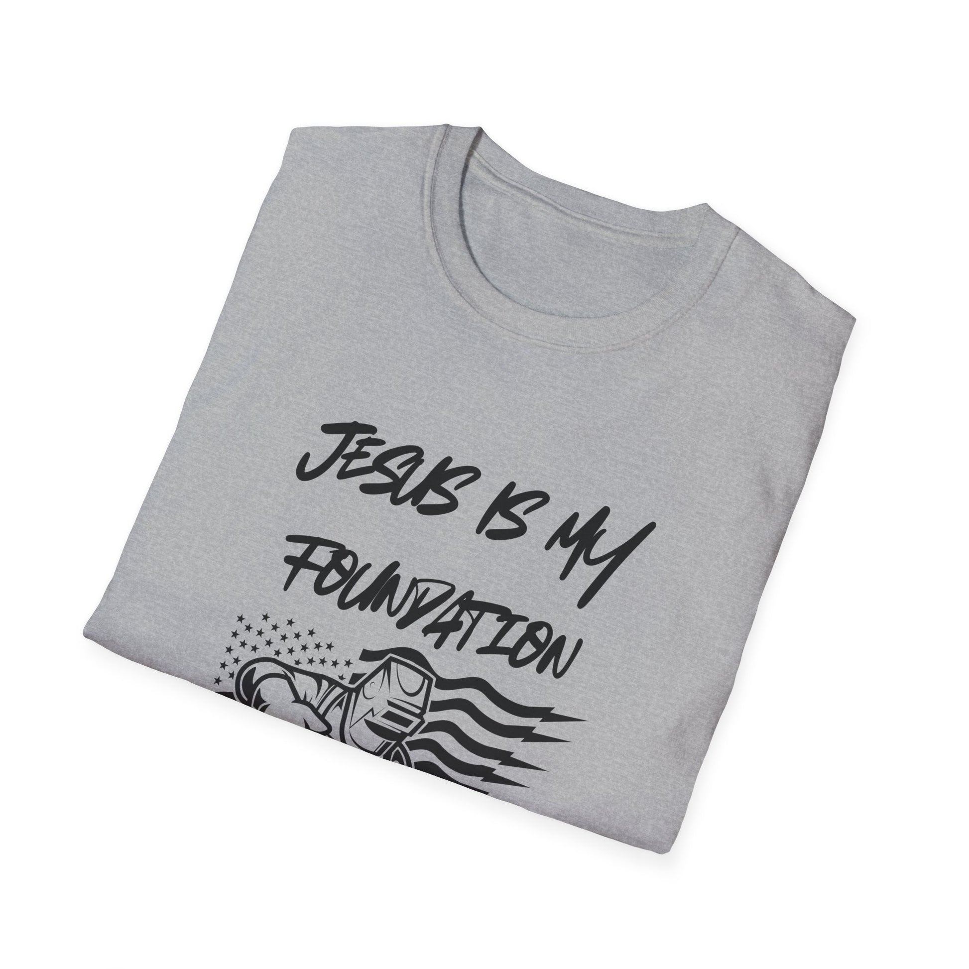 A patriotic design featuring a welder with an American flag in the background, with the words 'Jesus is my foundation' above and 'welding is my craft' below. This unisex softstyle t-shirt is perfect for those who are proud of their faith and craft, giving off a strong and dedicated vibe. Ideal for welders, Christians, and those who appreciate American pride. Perfect for wearing on Independence Day, Labor Day, or any patriotic celebration.