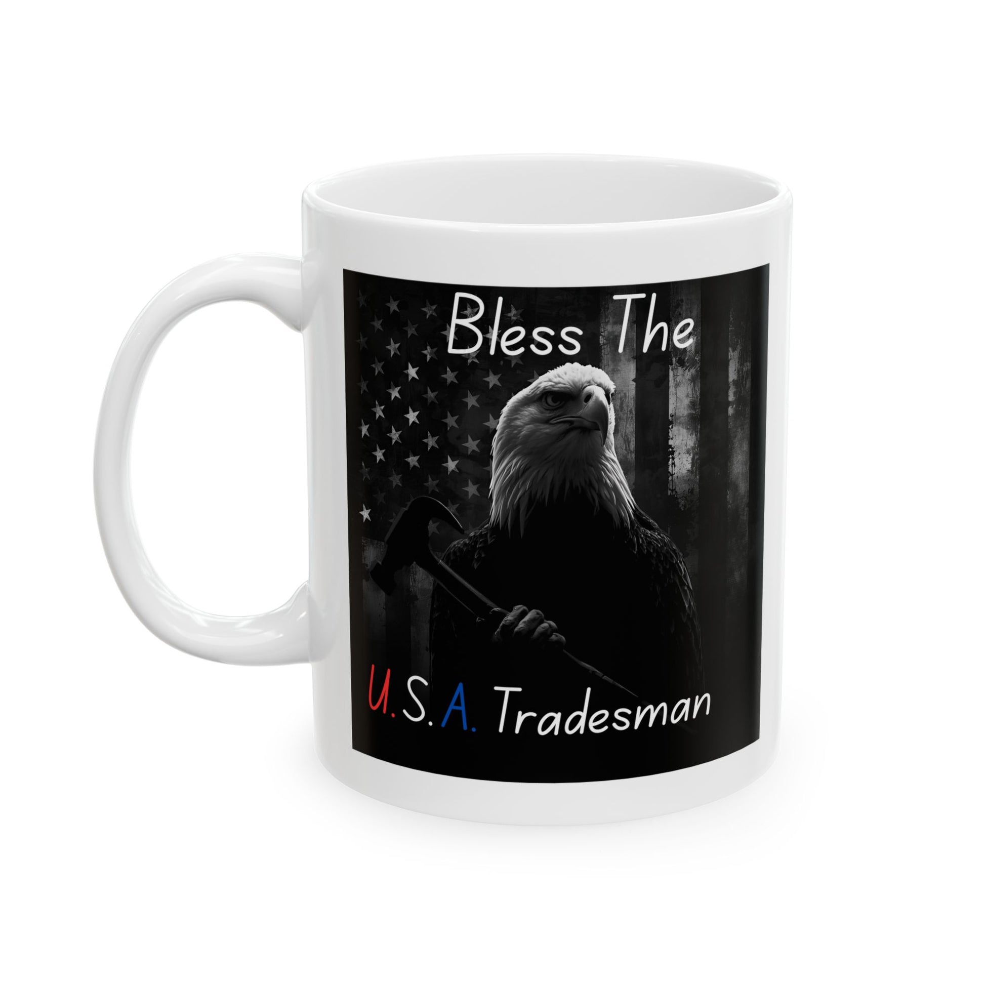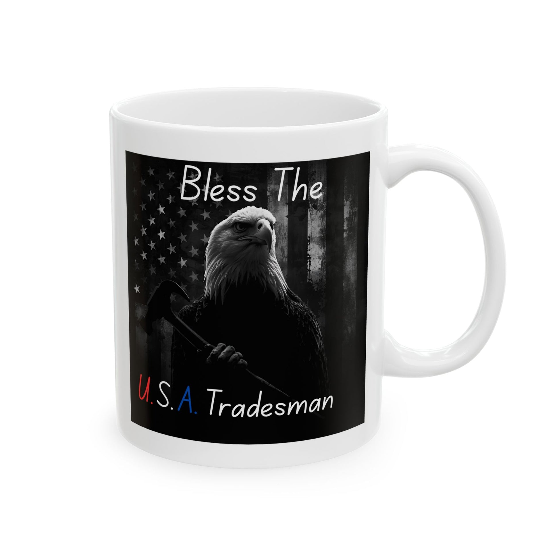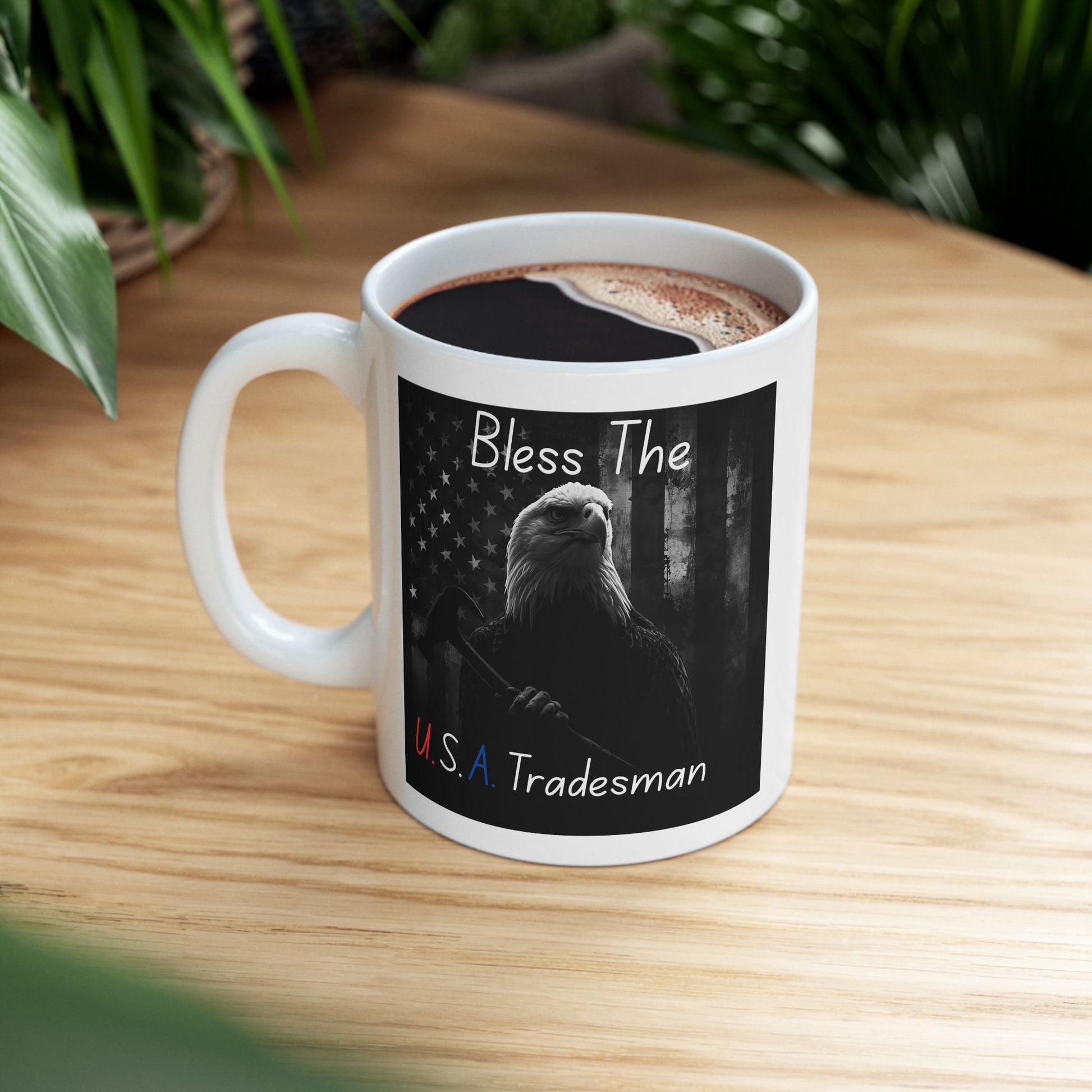 This patriotic 11 oz mug Bless the USA Tradesman is perfect for anyone who loves the USA. With a glossy finish and vibrant colors, this microwave and dishwasher-safe mug is both functional and eye-catching. It's ideal for daily use and makes a great gift for Independence Day celebrations.